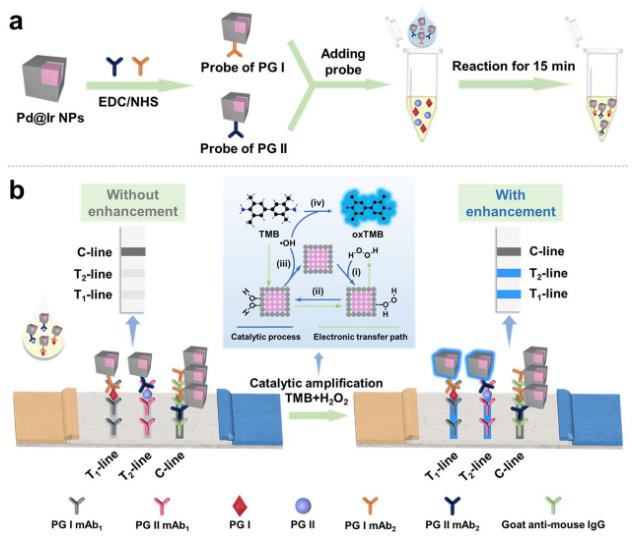 侧流免疫层析法(LFIA)尽管已被应用于疾病诊断领域,但存在灵敏度和定量能力有限的缺点。研究团队使用了一种比色信号的放大策略,即双金属纳米酶介导的原位催化报告分子沉积(BN-ISCRD),用于LFIA实现了超灵敏检测癌症生物标志物。由于两种金属的协同或相加作用,双金属纳米酶表现出比单金属纳米酶更优异的类酶活性。基于此,将其作为标记材料应用于LFIA,通过原位催化报告分子沉积,实现信号放大,提高检测灵敏度。将该方法应用于检测胃癌标志物(PG I和PG II),信号放大后裸眼检测限可达10 pg/mL,灵敏度提高了200倍;同时,成功地从36个临床样本中鉴别出8个胃癌阳性样本,与临床方法的检测结果一致。这种BN-ISCRD策略将新型纳米材料与生物传感技术结合,为构建超灵敏的即时检测平台提供了一种新方法。