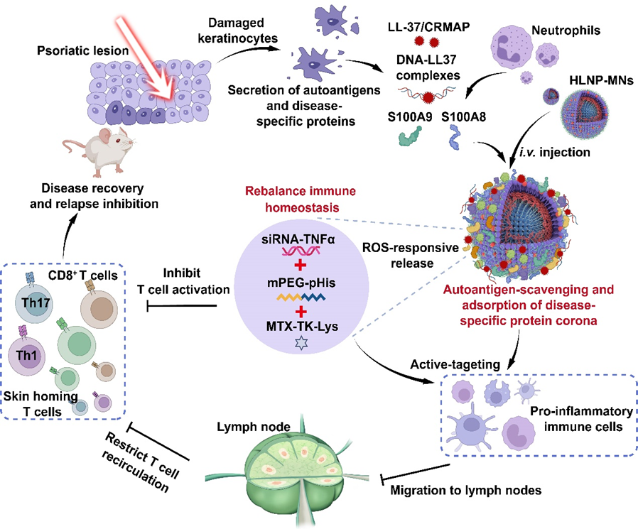 银屑病患者中性粒细胞分泌的抗菌肽LL-37是诱导皮肤嗜性的抗原特异性T淋巴细胞分化、激活和病灶浸润的关键。研究团队创新性构建了乙二醇-聚组氨酸和聚乙二醇-聚乳酸的自组装纳米体系,并进一步与siRNA-TNFα和寡聚赖氨酸修饰的甲氨蝶呤前药结合形成“三明治”结构的HLNP-MNs。HLNP-MNs在静脉注射后能特异性捕获银屑病小鼠血清中的LL37及“中性粒细胞胞外陷阱”信号通路相关蛋白,高效靶向银屑病相关外周炎症免疫细胞,并降低血清中“自身抗原”的水平;同时,siRNA-TNFα与甲氨蝶呤可协同作用,精确阻断“自身抗原”诱导的银屑病复发,并最终恢复机体免疫稳态。本研究提出了通过规避或利用纳米粒与疾病特异性蛋白冠的相互作用的药物靶向递送策略,为银屑病有效治疗提供了新思路。