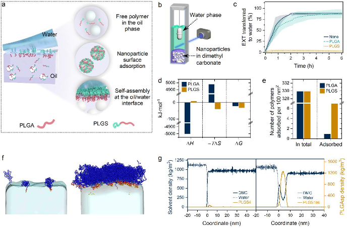 微粒制剂一直受到药物包载种类局限和载药量低等共性工程难题的制约,阻碍了其临床治疗潜力的充分发挥。有研究表明,两亲性聚合物能够显著提高多肽蛋白类药物的包载效率,然而,实现多肽蛋白类药物高效包载的作用机制仍不明晰。该团队运实验手段,结合分子动力学模拟,对两亲性聚合物抑制药物胶体颗粒相转移的作用机制进行了多层次分析。研究结果显示,具有高表面活性的两亲性聚合物不仅能在药物胶体颗粒表面形成稳定的吸附层,还能快速在油水界面自组装成致密的界面膜。通过对两亲性聚合物在整个体系中分布状态的分析,确认了游离状态是两亲性聚合物在油相中的主要存在形式。这一机制在不同种类的高表面活性载体材料及药物组成中都展现出了较高的通用性。该研究为我们理解高表面活性两亲性聚合物如何实现多肽蛋白类药物的高效包载提供了一个更为全面和深刻的视角。