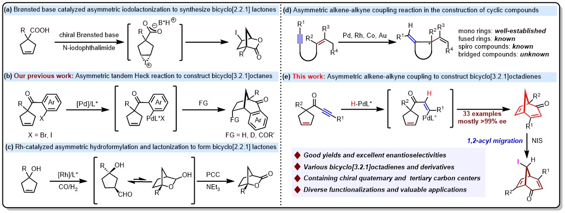 桥环化合物是众多天然产物和药物分子的核心骨架,具有独特的生物活性。然而,桥环化合物骨架刚性强,环张力大,且存在多个手性中心,使得该类骨架构建及立体选择性控制具有一定挑战性。近日,姚和权/林爱俊团队设计合成了一类含有炔基片段的环戊烯化合物,通过钯催化不对称分子内烯-炔偶联反应,高效构建了一类含有季碳和叔碳立体中心的手性二环[3.2.1]辛二烯桥环骨架。产物中的烯基和烯酮片段能够实现多种类型化学转化,极大丰富了产物结构多样性。此外,二环[3.2.1]辛二烯桥环化合物可经过碘鎓离子诱导发生1,2-酰基迁移,快速构建含有三个相邻手性立体中心的碘代二环[3.2.1]辛二烯桥环化合物。这一成果为手性桥环化合物的设计合成中提供了新策略和新思路。