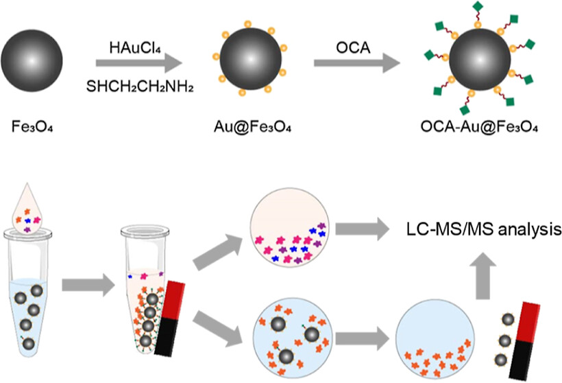 丁娅团队设计和构建了一种类病毒冠状结构的铁—金异质纳米颗粒,实现复杂生物基质中药物靶标的筛选。为了解决传统材料如琼脂糖、磁珠和葡聚糖凝胶作为固相基质的化学蛋白质组学,在识别药物靶标时普遍存在分离速度慢、效率低、操作复杂的缺点。课题组设计和制备的铁—金异质纳米颗粒结构中的氧化铁纳米粒具备超顺磁性,有利于蛋白质的富集纯化,而位于氧化铁纳米粒表面的金颗粒可提供众多结合位点,与各种含硫醇基团的小分子和生物分子药物形成S-Au共价键,修饰于异质纳米颗粒表面,减少非特异性结合。以奥贝胆酸作为模型药物,结果验证了该异质纳米颗粒可有效用于药物的富集和靶标筛选,且类病毒冠状结构比氧化铁纳米颗粒具有更高的灵敏度和选择性。