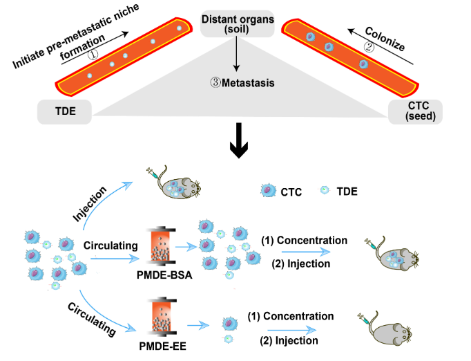越来越多的证据表明,作为一种由肿瘤细胞分泌的细胞外小囊泡,肿瘤外泌体(TDEs,大小为 30-150 nm)也是导致肿瘤转移的元凶之一。姜虎林教授团队进一步开发了一种促转移衍生物净化装置(Pro-metastatic derivatives eliminator,PMDE),PMDE可以有效地捕获并清除外周血中的CTCs和TDEs,并且具有良好的生物相容性。
