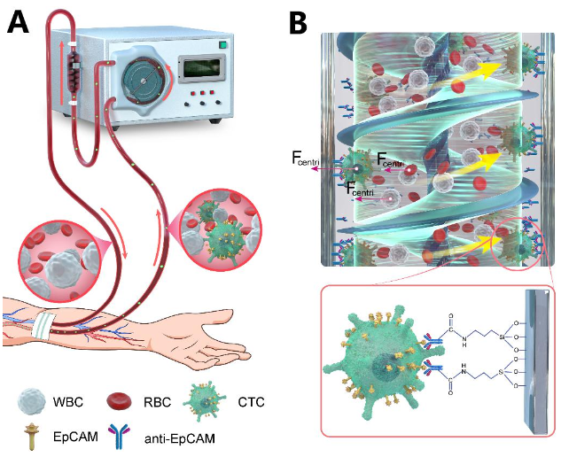肿瘤转移已成为约90 %癌症相关死亡的主要原因,而循环肿瘤细胞(CTCs)在转移过程中发挥着重要作用,所以作为无创临床诊断和预后评估的重要生物标志物,CTCs的检测和清除在预测癌症患者的总生存期和无进展生存期方面具有重要意义。然而,现有的CTCs分离和检测技术仅限于小体积的血样,不足以全面反映CTCs在全身的血行分布。受血液透析装置的启发,姜虎林教授团队开发了一种在全血中特异性清除循环肿瘤细胞的医疗设备,实现有效净化全血中的循环肿瘤细胞。