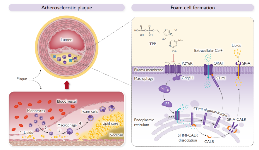 研究团队揭示了动脉粥样硬化中的新病机。研究人员基于临床样本、动脉粥样硬化动物模型和单细胞测序数据分析发现巨噬细胞P2Y6R在动脉粥样硬化病程中高表达。通过构建巨噬细胞特异性P2Y6R敲除小鼠,发现巨噬细胞P2Y6R敲除小鼠的主动脉斑块明显减少。结合转录组学测序、pull down实验、蛋白组学等实验方法揭示了P2Y6R参与动脉粥样硬化的深层机制。研究人员以P2Y6R为靶点,筛选具有P2Y6R抑制活性和巨噬细胞泡沫化抑制作用的药物,发现维生素B1的辅酶TPP具有优异的抑制活性。进一步发现TPP可减少脂质摄取,抑制巨噬细胞泡沫化的作用,减少动脉粥样硬化小鼠主动脉斑块的产生。该研究为动脉粥样硬化患者的治疗和动脉粥样硬化性心血管疾病高危患者的预防提供了新策略。