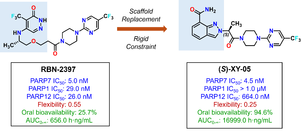PARP7是细胞中I型干扰素通路的主要抑制因子,抑制PARP7可重新激活cGAS-STING通路介导的先天免疫,并可增强由T细胞介导的适应性免疫,提高机体的抗肿瘤免疫应答。然而,目前还尚未有PARP7抑制剂被批准上市。该团队在RBN-2397结构的基础上,采用骨架跃迁和“刚性约束”策略,设计并合成了一系列具有全新骨架的衍生物,其中,化合物(S)-XY-05对PARP7的抑制活性强(IC50: 4.5 nM),亚型选择性好;其在ICR小鼠体内的生物利用度达到94.6%。在Balb/c小鼠CT26结肠癌细胞同种移植瘤模型实验中,(S)-XY-05灌胃给药25 mg/kg的抑瘤率高达83%,显著优于RBN-2397。体内机制研究显示,(S)-XY-05提高了肿瘤组织中T细胞的募集,而脾脏组织中的T细胞基本不变,说明(S)-XY-05可特异性激活肿瘤组织内的I型干扰素信号通路,而不影响其它组织,这也是PARP7抑制剂区别于其它肿瘤免疫疗法的重要特点。