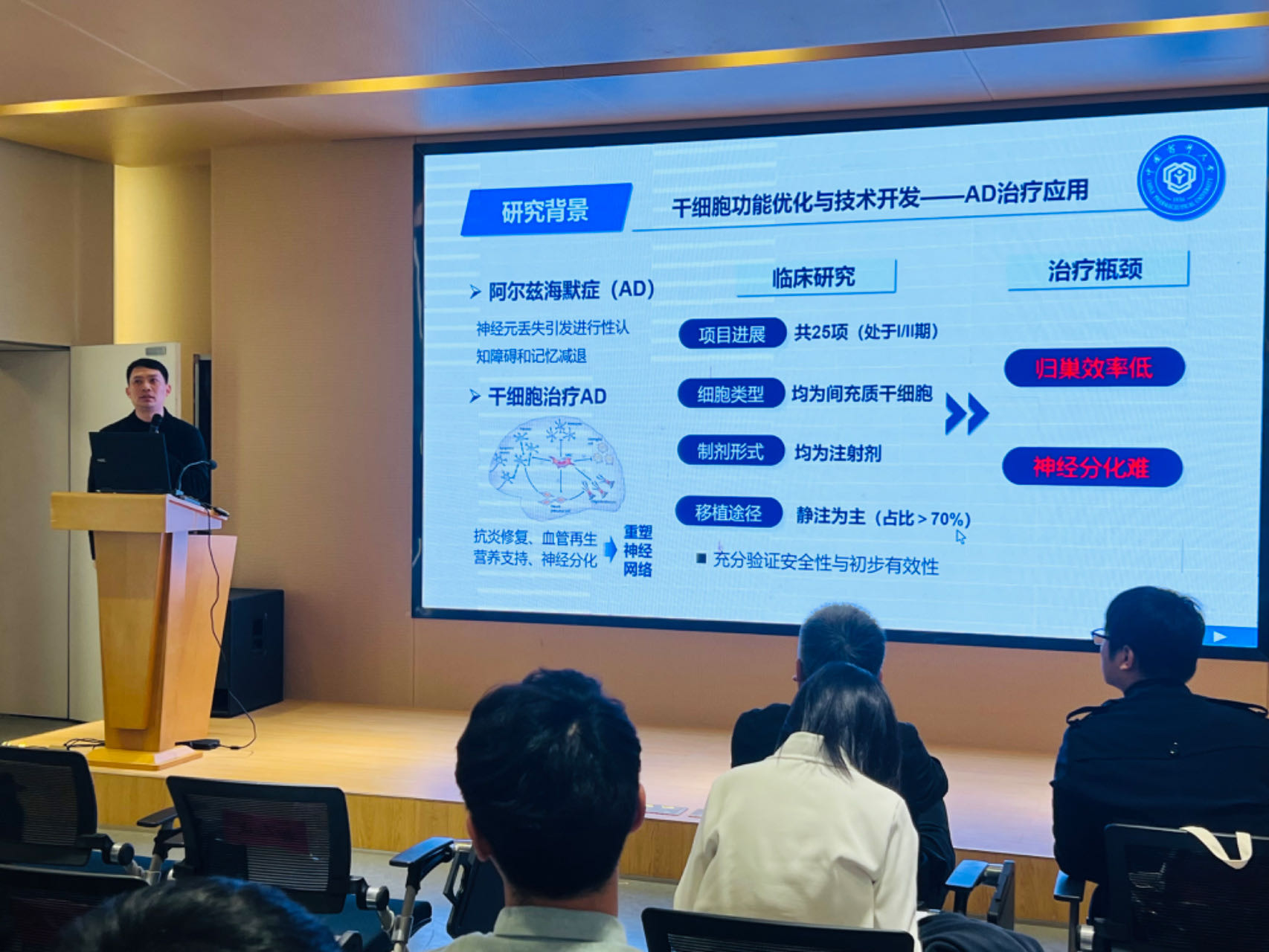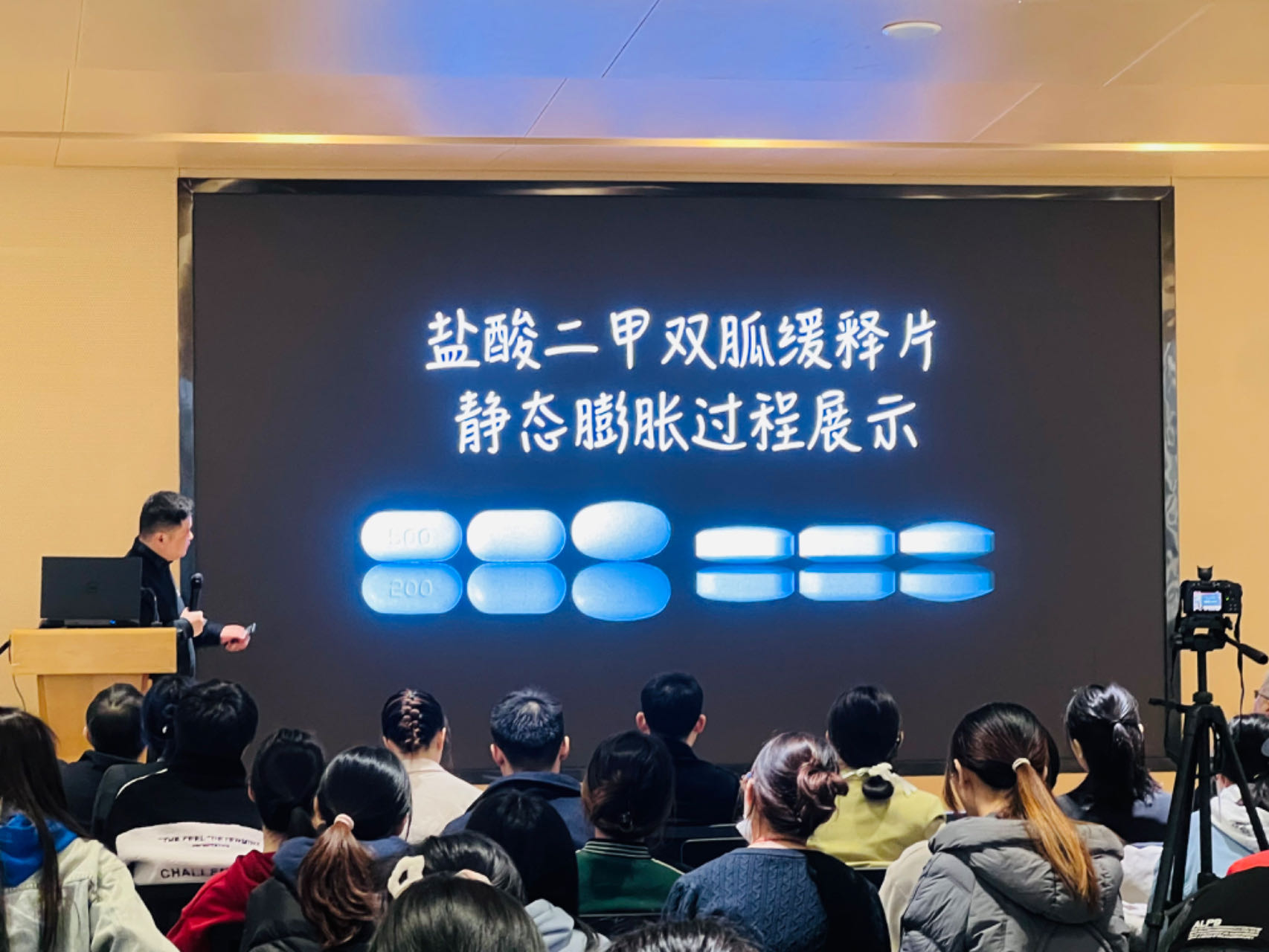 首先,四川大学华西蓝鲸体育邓黎副教授和公司蓝鲸体育药剂系副主任丁杨教授受邀先后作专家报告。邓黎副教授以“可视化技术用于固体制剂崩解释放特性的探索”为题,详细介绍并动画演示了如何利用可视化技术探索固体制剂崩解释放特性,阐述了药品研究创新的新方向,为在场观众呈现了一场视觉盛宴。丁杨教授以“干细胞疗法应用基础研究与转化思考”为题,围绕归巢效率低和神经分化难两个治疗瓶颈,介绍了研究团队在相关领域取得的重要成果。参会师生与两位专家进行了深入交流,现场气氛热烈。