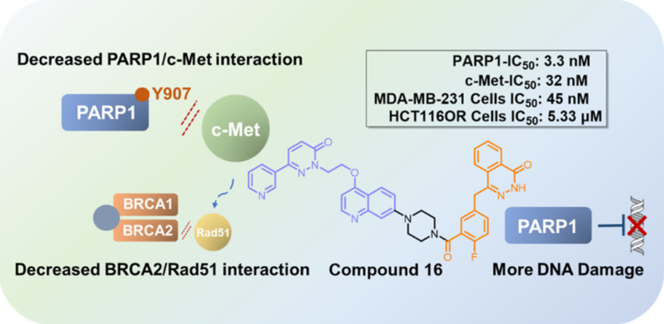 PARP1抑制剂是肿瘤精准治疗的代表性药物,目前已有6款PARP1抑制剂被批准上市用于携带BRCA1/2基因缺失或突变的乳腺癌、卵巢癌等肿瘤的治疗。虽然PARP1抑制剂在临床抗肿瘤治疗中取得了巨大的成功,然而大部分患者在长期使用后仍不可避免地产生耐药性(获得性耐药);此外,仍有40%携带BRCA1/2基因缺失或突变的肿瘤患者对PARP1抑制剂不敏感(原发性耐药性)。研究发现,c-Met扩增的肿瘤细胞可分别通过磷酸化PARP1和Rad51,导致肿瘤细胞对PARP1抑制剂产生原发性耐药和获得性耐药。说明c-Met是PARP1抑制剂应答的关键调节因子,PARP抑制剂和c-Met抑制剂同时使用,可以改善c-Met扩增的肿瘤患者对PARP1抑制剂的耐药性。基于这些发现,该团队以PARP1抑制剂Olaparib和c-Met抑制剂化合物1为先导化合物,通过合理药物设计,设计合成了一系列喹啉类衍生物。体内外活性筛选发现了优势化合物16,该化合物对两个靶点均具有较好的抑制活性(PARP1 IC50: 3.3 nM;c-Met IC50: 33.2 nM),且在BRCA突变型与野生型肿瘤细胞中均表现出优于Olaparib的抗增殖效果。值得注意的是,化合物16对c-Met扩增的BRCA野生型肿瘤细胞MDA-MB-231增殖的抑制活性(IC50 = 45 nM)是Olaparib(IC50 = 30.7 μM)的680倍,其对Olaparib诱导的获得性耐药细胞HTC116OR增殖的抑制活性(IC50 = 5.33 μM)是Olaparib(IC50 = 50.8 μM)的10倍。进一步体内药效评估表明,不管肿瘤细胞是否发生BRCA1/2突变,化合物16均能够有效抑制肿瘤的生长,并且显著优于Olaparib。总之,该团队开发出了首款PARP1/c-Met双靶点抑制剂,为解决由于c-Met扩增导致的PARP1抑制剂耐药性提供了新的方案。