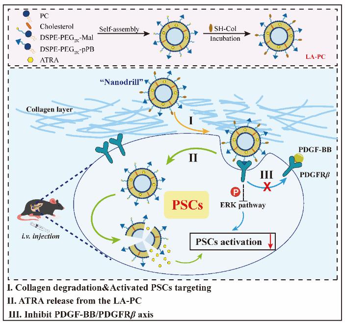 PSC的活化在CP的始动和演进过程中均发挥了重要作用,其分泌的致密ECM严重阻碍了治疗药物向靶部位胰腺的深层递送,大大削弱了药物的抗胰腺纤维化治疗效果。针对这一问题,该研究团队通过在脂质体表面负载胶原酶I和PSC靶向肽(pPB肽)设计了一种全新的PSC靶向调控平台(命名为LA-PC),胶原酶I能够有效分解CP胰腺中致密的ECM层,实现LA-PC的胰腺组织深层分布。此外,LA-PC表面修饰的pPB肽与激活的PSC表面血小板衍生生长因子受体β(PDGFRβ)相结合,增加PSC对药物的有效摄取。这一有效结合还能够抑制血小板衍生生长因子B(PDGF-BB)对PDGFRβ的激活,进而抑制其下游MAPK通路,抑制PSC的活化,有效治疗胰腺纤维化。该研究成果以“A PDGFRβ-targeting nanodrill system for pancreatic fibrosis therapy”为题发表在Chinese Chemical Letters上,论文第一作者为蓝鲸体育蓝鲸体育韩涵博士后和陈比特硕士生,蓝鲸体育姜虎林教授和邢磊副教授为本文共同通讯作者。