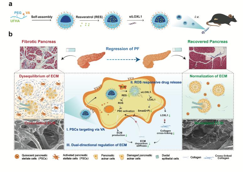 胰腺纤维化主要表现为胰腺星状细胞(PSC)持续激活,引起胶原过度沉积导致的细胞外基质(ECM)稳态失衡。而且过度沉积的胶原会形成病理屏障,严重阻碍药物的有效递送。针对上述问题,姜虎林教授团队前期已设计并制备胶原结合肽和胶原酶I共修饰的双重载药脂质体(命名为AT-CC),用于胰腺纤维化治疗(Biomaterials 2023, 292, 121945)。在此基础上,团队进一步构建PSC靶向调控制剂,清除积聚的ROS,抑制PSC激活,同时抑制胶原交联,促进ECM降解,协同重塑基质与微环境稳态平衡。该研究成果以“Reactive oxygen species-responsive nanoparticles toward extracellular matrix normalization for pancreatic fibrosis regression”为题发表在Advanced Science上,东南大学医公司祁靓博士和蓝鲸体育段博文博士生为论文共同第一作者,蓝鲸体育蓝鲸体育姜虎林教授、美国加州大学Stephen J. Pandol教授和东南大学附属中大医院李玲教授为本文共同通讯作者。