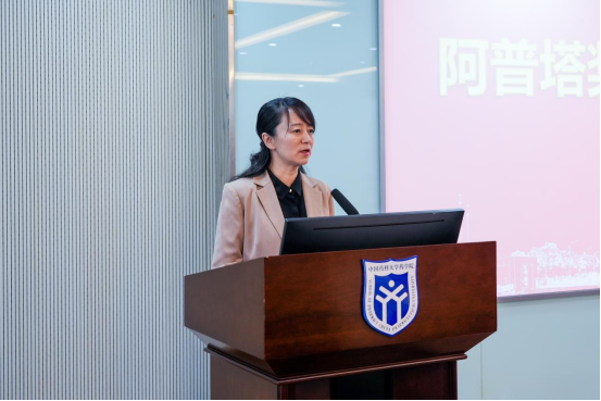 阿普塔医药事业部战略市场总监富天骄致辞,对获奖员工表达祝贺,鼓励药大学子坚定使命感与责任感,保持热爱,耐住寂寞,早日成为国之栋梁。
