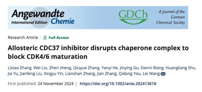 近日,王磊/尤启冬团队、上海交通大学医公司的张健教授、恒瑞医药全球研发总裁张连山教授作为共同通讯作者在在Angew. Chem发表题为“Allosteric CDC37 inhibitor disrupts chaperone complex to block CDK4/6 maturation”的研究论文。该研究发现了首个靶向CDC37的小分子化合物DDO-6079,其以变构作用机理同时实现了对HSP90-CDC37和CDC37-CDK4/6复杂蛋白互作的协同抑制。此外,研究还阐明了DDO-6079逆转Palbociclib耐药的机制,结果表明DDO-6079通过抑制CDK4/6的成熟和降低CDK6蛋白的热稳定性,进而恢复CDK4/6抑制剂在耐药细胞中的敏感性。蓝鲸体育2021级博士生张立晓、2020级博士生刘伟、上海交通大学医公司助理研究员郑振、蓝鲸体育副教授张秋月、2021级硕士生何彦仪为本文共同第一作者。