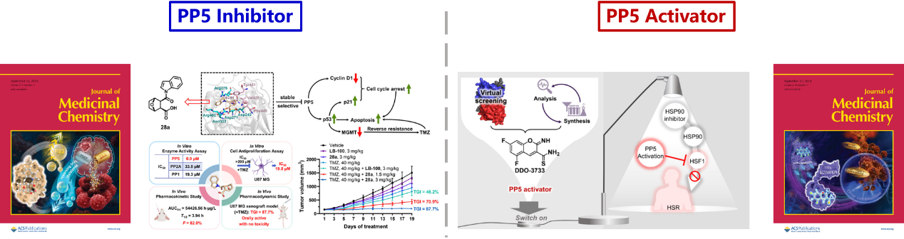 PP5也是一种重要的共伴侣蛋白,同时具有磷酸酶属性,负责调节底物蛋白的磷酸化状态,进而影响底物蛋白的活性、稳定性等重要特性。然而,目前对调控PP5的继发生物学效应研究尚不明确,致使靶向PP5药物应用受限。为此,王磊/尤启冬团队同时进行PP5抑制剂和激动剂开发,并先后在J. Med. Chem发表题为“Design and Synthesis of 7 Oxabicyclo[2.2.1]heptane-2,3-dicarboxylic Acid Derivatives as PP5 Inhibitors To Reverse Temozolomide Resistance in Glioblastoma Multiforme”和“Allosteric Activation of Protein Phosphatase 5 with Small Molecules”的研究论文,且均为当期封面文章。PP5抑制剂28a可诱导细胞周期阻滞和逆转TMZ耐药性;PP5激动剂DDO-3711的研究解决了因PP5自抑制状态产生的激动剂设计难题,还发现其与HSP90抑制剂联合使用在降低热休克蛋白毒性方面的潜在价值。两项研究探索了PP5调控效应及应用,为PP5的研究和应用提供了新的工具和思路。蓝鲸体育王磊研究员和尤启冬教授为通讯作者,2021级博士生李泽坤、2022级硕士生郭沫辰和2023级硕士生顾明晓为抑制剂研究共同第一作者,蓝鲸体育副教授张秋月、2021级硕士生颜玲和2021级博士生张立晓为激动剂研究共同第一作者。