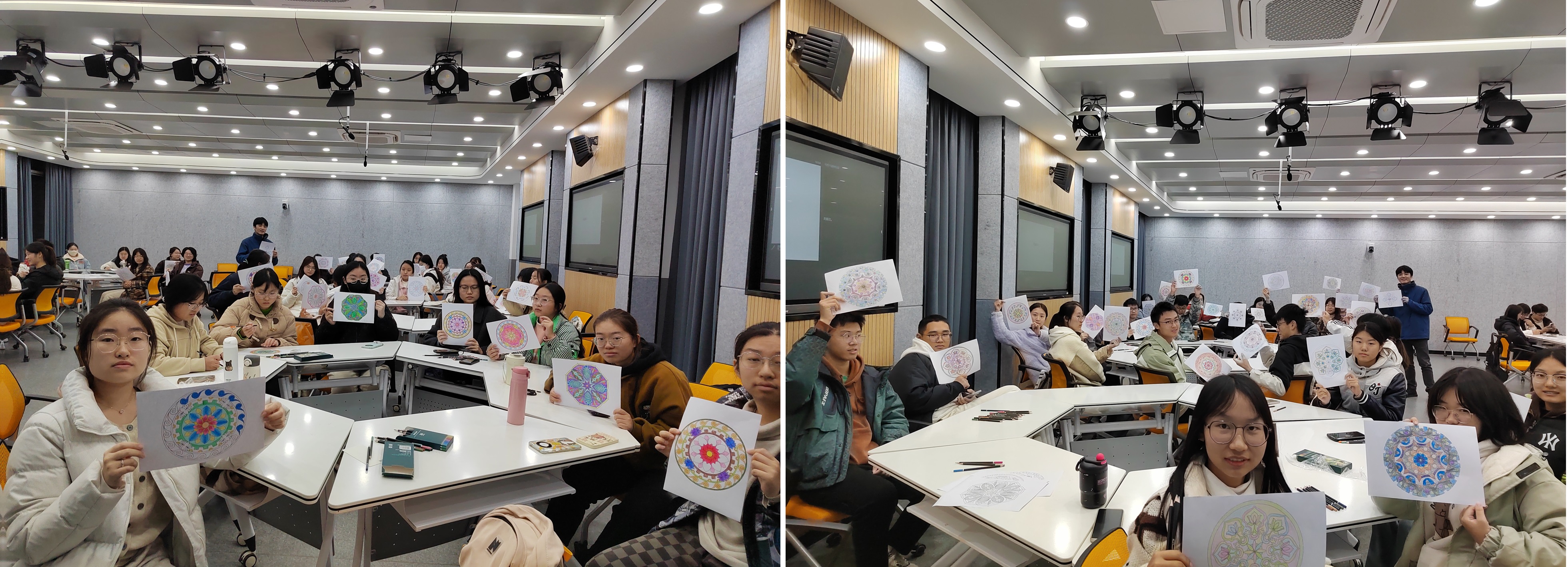 绘画创作环节,同学们沉浸于内心探索,手持画笔,在曼陀罗图案内自由挥洒色彩、填充线条,或专注于色彩搭配,用鲜明色调表达内心的热情与活力;或精心勾勒线条,以细腻笔触描绘出内心的宁静与秩序。分享交流阶段,同学们敞开心扉,讲述画作背后的故事与情感,纷纷表示绘画过程将内心的焦虑驱散,形成平和向上的积极心态。