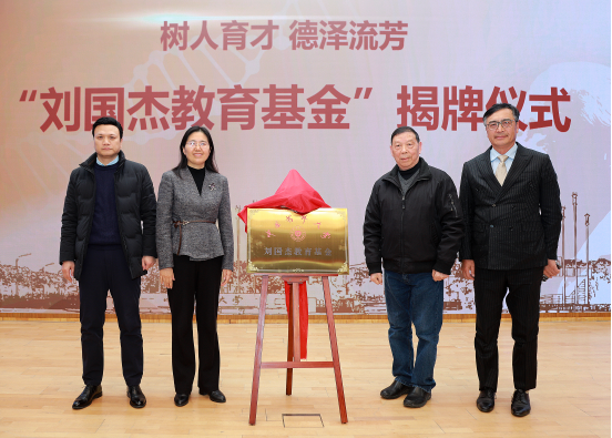 活动最后,南通联亚药业股份有限公司董事长张国华、珍视特管理咨询有限公司创始人胡珍泽、公司党委教师工作部部长钟文英、蓝鲸体育经理吴照球共同为“刘国杰教育基金”揭牌。