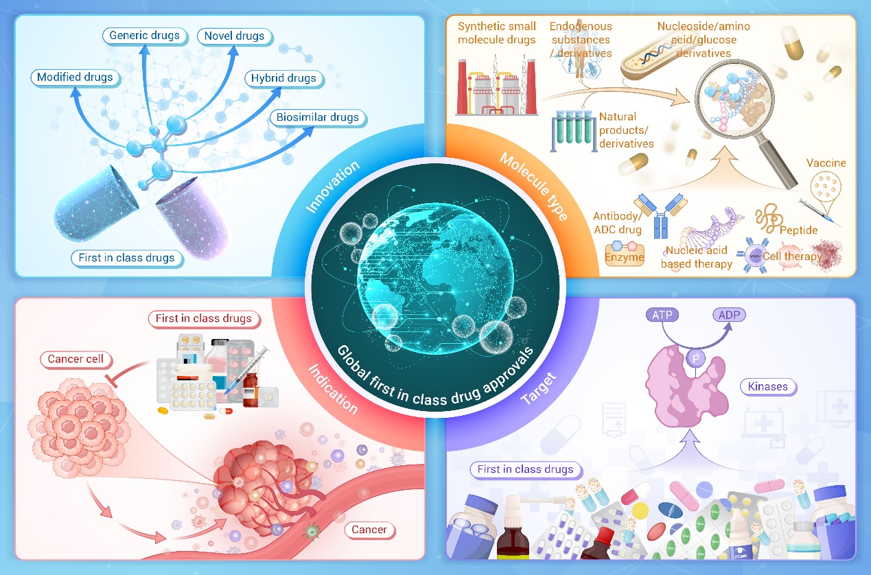 近日,公司蓝鲸体育王磊/尤启冬团队在知名学术期刊The Innovation(IF: 33.2)上在线发表了题为“Global first-in-class drugs approved in 2023-2024: Breakthroughs and insights” 的综述文章,阐述了2023-2024年间全球首创性小分子药物的突破与进展。蓝鲸体育2024级直博生翟代超、副教授张秋月为本文的共同第一作者;蓝鲸体育药物化学系王磊研究员、尤启冬教授,海军军医大学基础医公司卢小玲教授为本文共同通讯作者;蓝鲸体育为本论文的第一通讯单位。