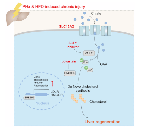 研究团队通过整合转录组数据,发现膜转运蛋白SLC13A2是肝大部切除术(PHx)后肝脏再生的关键调节因子。SLC13A2的表达在PHx术后迅速降低,并随着肝脏重量和生理功能的修复而逐渐升高至正常水平。研究团队通过构建肝脏特异性过表达或缺失的小鼠模型,证明SLC13A2促进PHx术及HFD饮食长期喂养造成慢性损伤而诱导的肝再生。机制研究表明:SLC13A2转运柠檬酸,柠檬酸经ACLY催化裂解释放乙酰辅酶A用于胆固醇合成,促进SREBP2活化及胆固醇代谢相关基因(LDLR、HMGCR等)的表达。HMGCR抑制剂洛伐他汀抵消SLC13A2促进的肝脏再生。此外,ACLY抑制剂通过抑制SLC13A2介导的柠檬酸裂解,抑制胆固醇合成,阻遏肝细胞增殖和肝脏再生。研究团队由此提出:由SLC13A2转运的柠檬酸作为中间代谢物恢复肝脏再生的代谢平衡,有望成为减轻肝损伤、促进肝修复的潜在药物靶标。