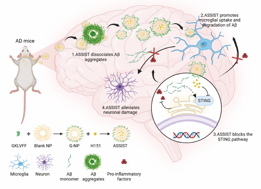 基于上述发现,提出一种Aβ-STING 协同免疫抑制疗法ASSIST(Aβ-STING Synergistic ImmunoSilencing Therapy)。其为一种可跨血脑屏障的纳米胶束制剂,竞争性地解聚 Aβ 斑块并防止再聚集,从而携带Aβ以低聚态的形式选择性地被小胶质细胞而非神经细胞吞噬;进入小胶质细胞后,释放STING抑制剂,阻断炎症信号,恢复Aβ清除的功能,并减少神经元损伤,协同改善认知障碍。