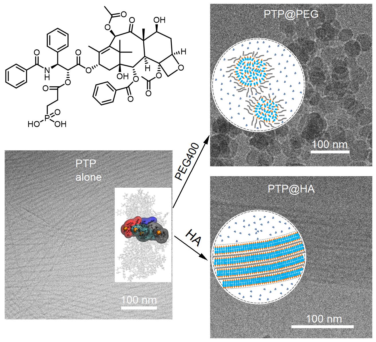 围绕这一命题,刘东飞教授团队以紫杉醇这一结构复杂、抗肿瘤活性显著的天然产物为模型,探索氢键驱动的形貌可编程装配。团队设计合成两亲性紫杉醇磷酸化衍生物(PTP),通过引入亲水性磷酸基团增强氢键作用,自组装形成纳米纤维;进一步与聚乙二醇400(PEG400)或透明质酸(HA)共组装,可分别获得球形纳米颗粒(PTP@PEG)与纤维束(PTP@HA),实现按需的递送功能分配。在4T1乳腺癌小鼠中,静脉给药的PTP@PEG显著延长体循环、降低肾脏蓄积并增强抗肿瘤效应;在结直肠癌腹膜转移模型中,腹腔给药的PTP@HA呈现持续释放并取得良好疗效。该研究系统展示了利用氢键调控实现药物组装形貌的精准控制,为单一药物跨疾病场景的有效递送提供了通用思路。