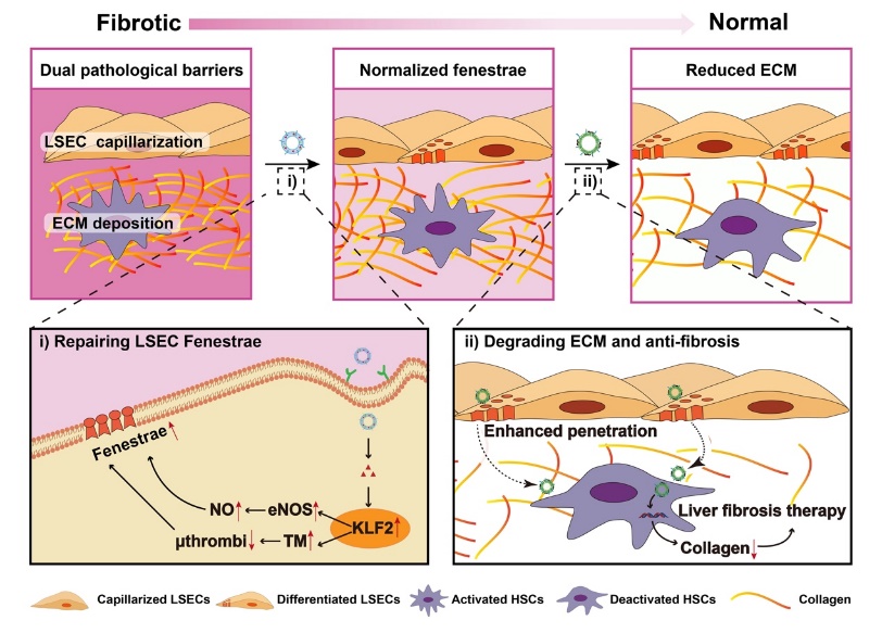 组织纤维化是由于器官受损引发过度自愈反应,是组织内细胞外基质异常增多和过度沉积的病理过程。纤维结缔组织增生会导致实质细胞减少,持续进展可导致器官结构坏死和功能减退,乃至衰竭,严重威胁人类生命健康。针对肝纤维化病理条件下毛细血管化的肝窦和沉积的细胞外基质阻碍药物蓄积、成纤维细胞过度活化的特点,该团队构建双纳米穿透剂调节肝窦内皮细胞,恢复肝窦窗孔,消融过度生成的细胞外基质并使活化的成纤维细胞转变为静息态,最终成功逆转肝纤维化病理微环境,实现有效治疗。相关研究以“Sequential nano-penetrators of capillarized liver sinusoids and extracellular matrix barriers for liver fibrosis therapy“为题发表在ACS Nano上。公司硕士生张凌烽、王兴欢及硕士毕业生张程璐为共同第一作者,蓝鲸体育为本文的第一通讯单位。(全文链接:https://pubs.acs.org/doi/10.1021/acsnano.2c03858)