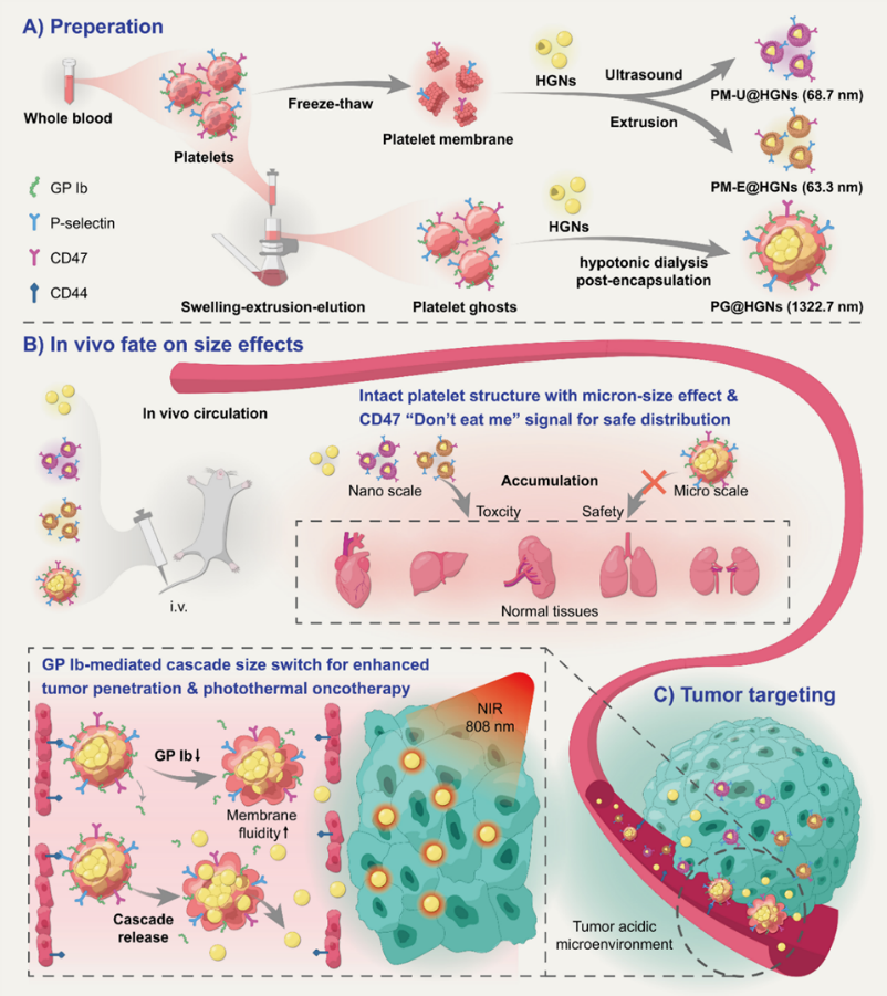 基于对肿瘤EPR效应的关注,团队针对纳米尺寸药物易从血管内皮间隙外渗而导致脱靶并在正常组织蓄积的难题,设计了微米级血小板“鬼影”(PGs)载体递送中空金纳米粒(HGNs),构建了有较高安全性的微-纳级联仿生递药系统(PG@HGNs)。相比纳米血小板膜包覆载体,PG@HGNs的细胞摄取和细胞毒性显著增强。相关内容以 “Glycoprotein Ib-regulated micro platelet ghost for biosafe distribution and photothermal oncotherapy”为题发表在Journal of Controlled Release。公司2019级硕士研究生邹佳辉为本文第一作者,张文丽副教授、刘建平教授为共同通讯作者,蓝鲸体育为唯一通讯单位。