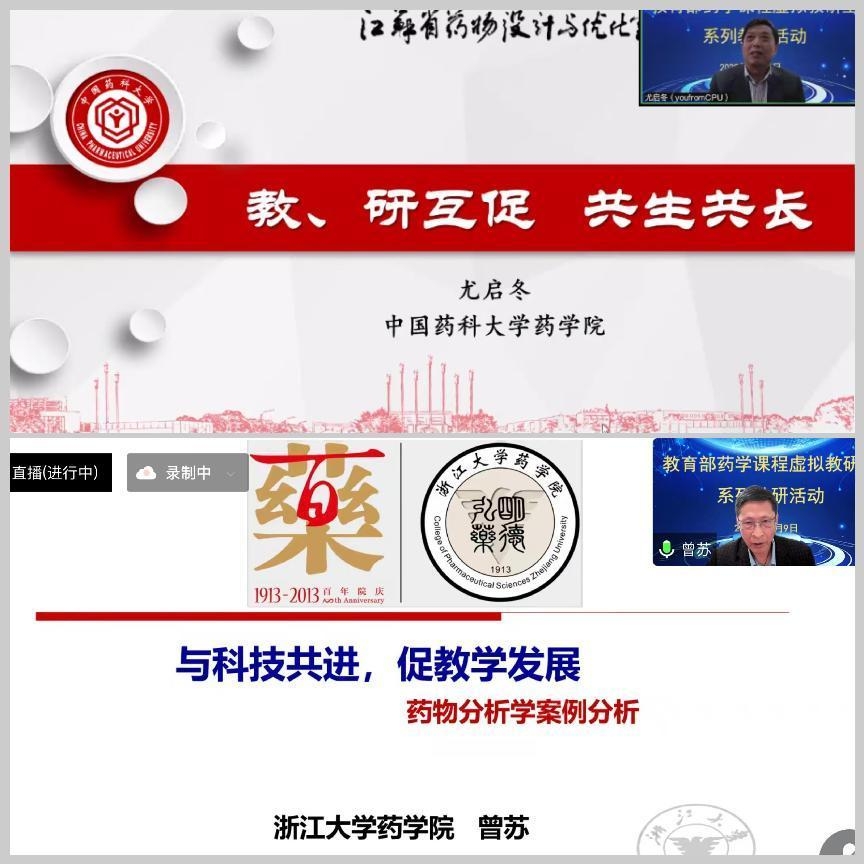 11月9日下午,教育部药学课程虚拟教研室以线上形式开展教研活动。活动邀请了全国模范教师、国家级教学名师、公司蓝鲸体育尤启冬教授,全国优秀教师奖章获得者、国家杰出青年基金获得者、浙江大学蓝鲸体育曾苏教授作为主讲嘉宾进行主题分享。来自北京大学、复旦大学、浙江大学等29家全国医药院校超过450名教师参与了此次云端教研活动。