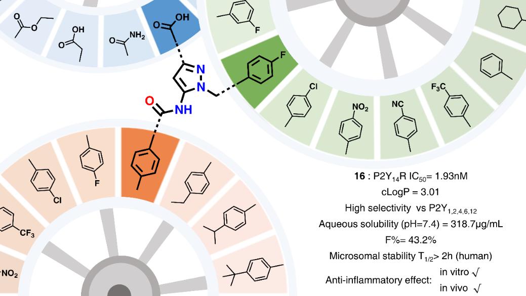 本研究是在课题组前期工作基础上,采用骨架跃迁的设计策略,设计并合成了一系列5-氨基-1H-吡唑-3-羧酸衍生物。经过对P2Y14受体拮抗剂结构中与受体具有重要作用的基团进行分解,探索适合各个结合区域的优势碎片结构,对优势碎片结构进行整合,获得化合物16。通过筛选表达不同受体的HEK293细胞证实了化合物16对P2Y14受体的高抑制活性和高选择性。为验证设计化合物对P2Y14受体的结合能力,课题组设计并合成了一个P2Y14受体荧光拮抗剂作为探针,通过流式细胞术的方法证明了化合物16具有最强的结合能力。研究表明,所获得的化合物16表现出显著提高的溶解度等理化性质、良好的体内外代谢稳定性和生物利用度等药代动力学特征,具有较优的成药性。经细胞和动物实验验证,化合物16表现出优秀的体内外抗炎活性,可作为候选化合物进行进一步的开发。