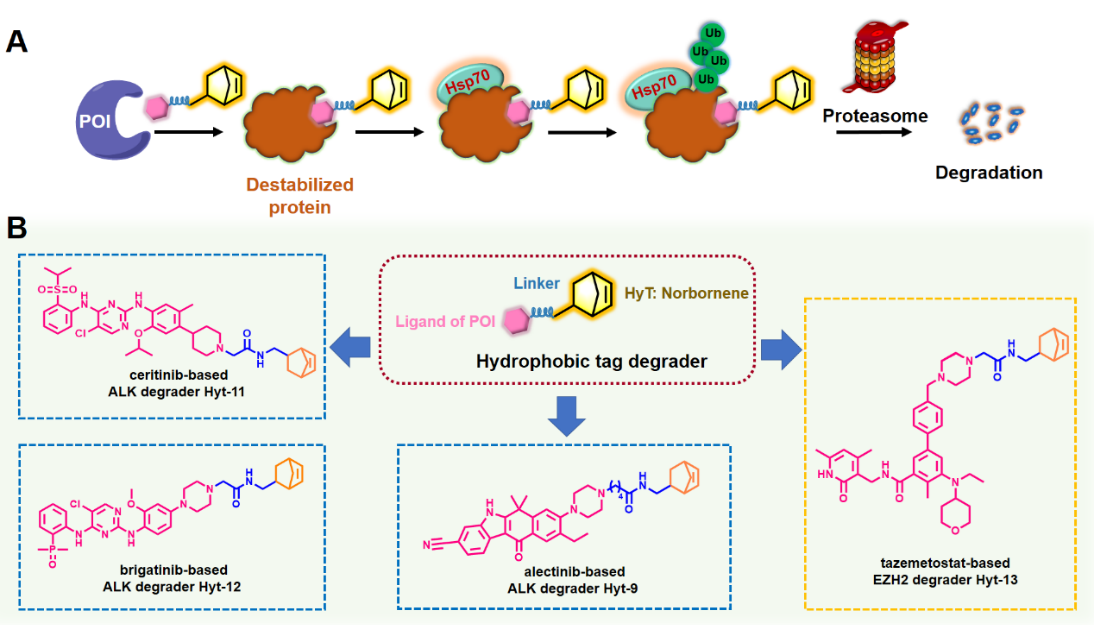 课题组在前期研究的基础上(J. Med. Chem. 2021, 64, 13, 9120–9140),为克服靶向间变性淋巴瘤激酶(anaplastic lymphoma kinase, ALK)的PROTAC降解剂Q2因分子量较大导致生物利用度过低等成药性问题,以ALK抑制剂Alectinib的母核苯并咔唑为骨架,通过与各类结构新颖的疏水标签相连接,设计并合成了一系列新型的疏水标签降解剂。并进一步通过对ALK亲和性、抗细胞增殖活性以及降解能力的实验考察,筛选发现了降冰片烯是一种优良的疏水标签片段,可用于蛋白降解分子的研究。通过继续对连接链长以及结构中双键等进行系统构效关系探索研究,最终确定疏水标签Hyt-9为优选分子,从而开展了进一步的降解实验考察和作用机制研究。最后,课题组继续将降冰片烯应用于ALK靶点的另外两种抑制剂Ceritinib和Brigatinib的研究,同样发现蛋白降解剂Hyt-11 和Hyt-12可以靶向降解ALK蛋白。此外,研究还发现该疏水标签还可应用于难治性靶标EZH2,论文中基于EZH2抑制剂Tazemetostat设计的疏水标签分子Hyt-13在降解EZH2靶蛋白的同时,也显著提升了抗肿瘤细胞增殖活性。以上研究结果提供了一种新型的成药性优良的疏水标签,进一步拓宽了蛋白降解技术的应用范畴。