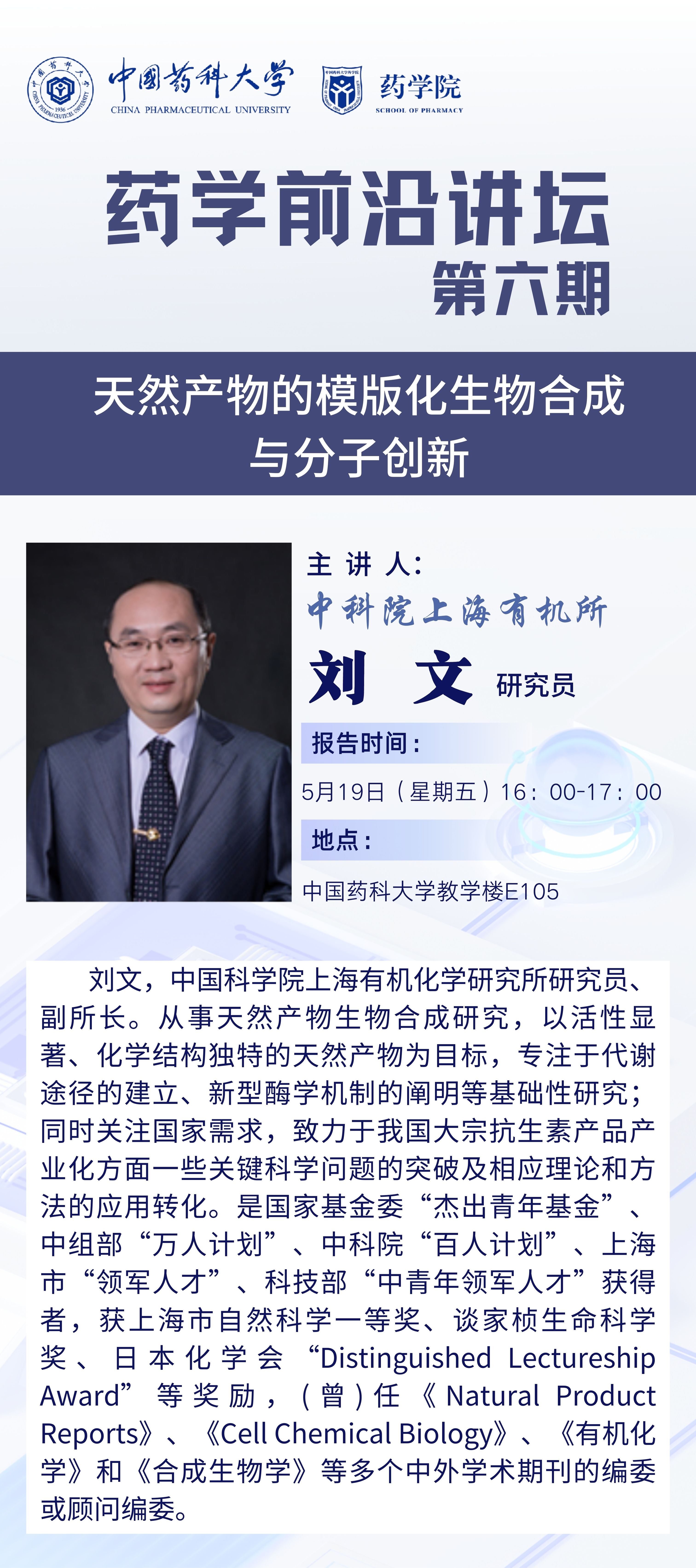 蓝鲸体育第六期药学前沿讲坛通知
