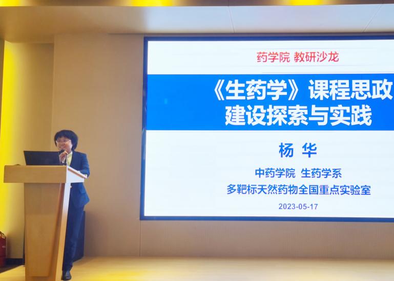 教育部课程思政教学名师、国家优秀青年基金获得者、药物科学研究院副经理杨华以“《生药学》课程思政建设探索与实践”为题,以《生药学》课程为例,从课程情况与发展历程、课程特点与思政设计、资源建设与教学实践、团队建设与人才培养等方面作分享,指出做好课程思政应该做到强政治、树情怀、精专业、明特色、实举措、凝团队。