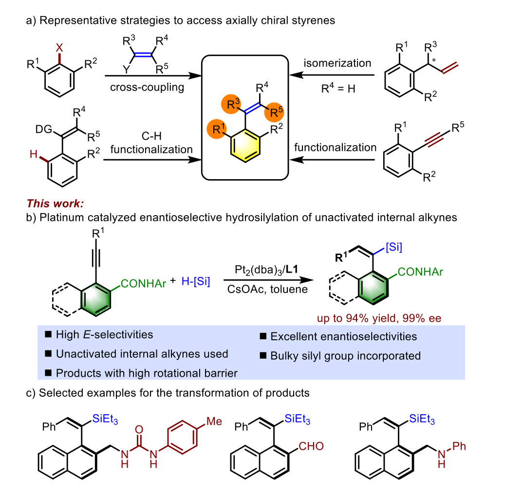 近日,国际著名期刊Angewandte Chemie International Edition(IF:16.823)在线发表了公司蓝鲸体育姚和权/高尚团队题为“Atroposelective Synthesis of Axially Chiral Styrenes by Platinum-Catalyzed Stereoselective Hydrosilylation of Internal Alkynes”最新科研成果。蓝鲸体育2022级博士研究生吴启民为本论文的第一作者,姚和权教授和高尚特聘副研究员为本文的共同通讯作者,蓝鲸体育为本文的唯一通讯单位。