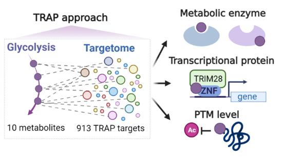 过度活跃的糖酵解通路是大多数癌细胞代谢特征之一,以往研究表明代谢物可作为信号分子发挥非代谢的调控功能,研究团队提出通过描绘糖酵解通路上主要代谢物的靶标组,深入理解糖酵解支撑肿瘤发生发展的机制。团队创新性建立了靶标响应可及性变化谱TRAP技术(Target-Responsive Accessibility Profiling),在癌细胞系中描绘了10种糖酵解代谢物的靶标组,共发现913个可及性变化的候选靶标。进一步的机制研究揭示了糖酵解代谢物对靶标组的丰富调控模式,包含干扰碳代谢酶的活性、影响转录蛋白的功能及靶标的翻译后修饰水平等。