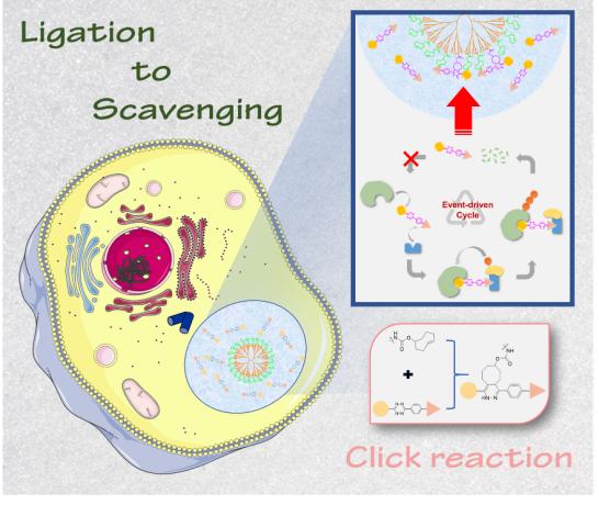 随着蛋白降解靶向嵌合体技术(PROTACs)蓬勃发展与广泛应用,如何实现靶蛋白的可控降解和按需终止成为亟待解决的关键性问题。该研究原创性提出了能够即时终止蛋白降解过程的连接-清除(Ligation to Scavenging)策略。该策略由四嗪标记的PROTAC分子(Tz-PROTACs)和反式环辛烯(TCO)修饰的树枝状大分子PAMAM-G5-TCO组成。基于树枝状分子的巨大表面和四嗪-TCO的逆电子需求的狄尔斯-阿尔德反应(IEDDA)的高反应性,该系统可通过IEDDA反应快速清除游离的PROTACs,从而实现靶向蛋白降解的终止调控,使已下调的靶蛋白逐步恢复到正常水平。研究通过对BET蛋白、PARP蛋白等多个底物蛋白的降解终止论证了该策略的可靠和适用性,为PROTAC降解技术装上了可靠的“刹车”。