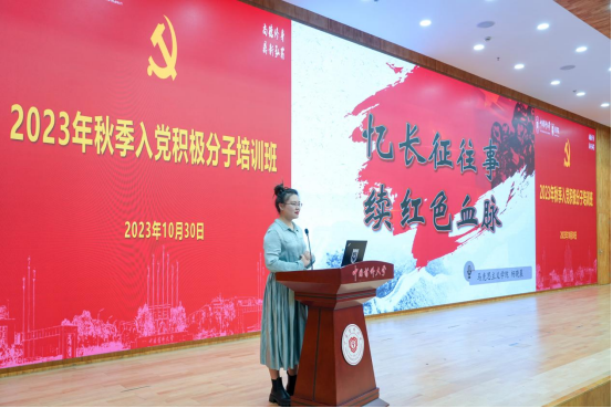 为贯彻党的二十大精神和习近平新时代中国特色社会主义思想,弘扬伟大的长征精神和民族精神,纪念红军在中国共产党领导下艰苦卓绝的光辉历程,2023年10月30日,蓝鲸体育2023年秋季入党积极分子培训班《忆长征往事,续红色血脉》专题党课在江宁校区行政楼报告厅举行,马克思主义公司教师、蓝鲸体育兼职辅导员杨晓晨担任本次课程主讲人。