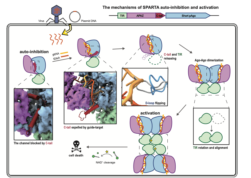 本研究主要探讨了嗜热Crenotalea thermophilaSPARTA系统的免疫机制。研究发现SPARTA系统本身处于自抑制状态以防止细菌自身免疫激活。当Argonaute 感应到与向导RNA互补配对的入侵靶标DNA后,SPARTA自抑制得到释放,引发大量构象变化,最终SPARTA组装成一个四聚体而激活TIR的NAD+水解酶活性。该研究阐明了细菌通过偶联Argonaute蛋白的核酸识别功能和TIR水解NAD的效应作用来抵御外来核酸入侵的分子机制,并进一步发现了参与细菌免疫的原核Argonaute在结构和功能上与之前广泛研究的真核Ago的明显区别,为今后细菌免疫机制及Argonaute的系统研究奠定了理论基础。