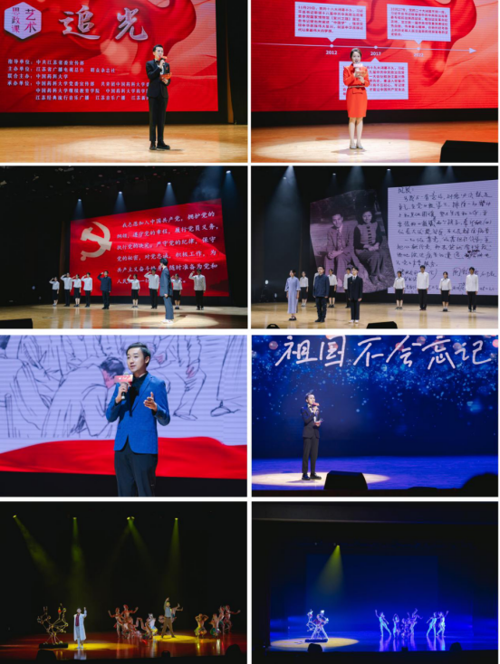 本场艺术思政课分为“不忘初心 方得始终”“踔厉奋发 勇毅前行”“青春奋斗 热血奉献”“丹心向党 寄语未来”四个篇章。其中,舞台剧《榜样的力量——徐国钧》生动演绎了中国著名生药学家、药学教育家、中国科院院院士、公司教授徐国钧先生以“一辈子办成一件事”的执着坚守,潜心技术攻关撑起中国药学事业铮铮铁骨的故事。《雨花英烈袁咨桐的故事》《以英烈之名,守护红色星火》《瞿独伊和〈国际歌〉》等深情展现出无数革命者信仰始终如一,初心始终如一的革命斗志。《祖国不会忘记》《苏州成为邓小平“小康之家”构想的印证之地》等节目刻画了新中国建设时期各行各业无数劳动者的无私奉献与中国共产党人勇于革新的鲜明品格。《习近平总书记考察纪实〈江南正是奋进时〉》中习近平总书记的殷殷嘱托、切切希望为新时代江苏发展指明了前进方向,提供了根本遵循,注入了强大动力。《陈延年陈乔年无畏赴死》等节目的精神令人潸然泪下,感召着新时代青年将青春热血融入党和人民的事业。随后红叶舞蹈团以原创舞蹈《追光者》展现了当下中国科学家群像,展现科学工作者们不畏艰难、无私奉献、勇于创新的良好精神风貌,号召中国药大青年继承发扬新时代科学家精神,在追“光”逐梦的道路上奋斗不止。